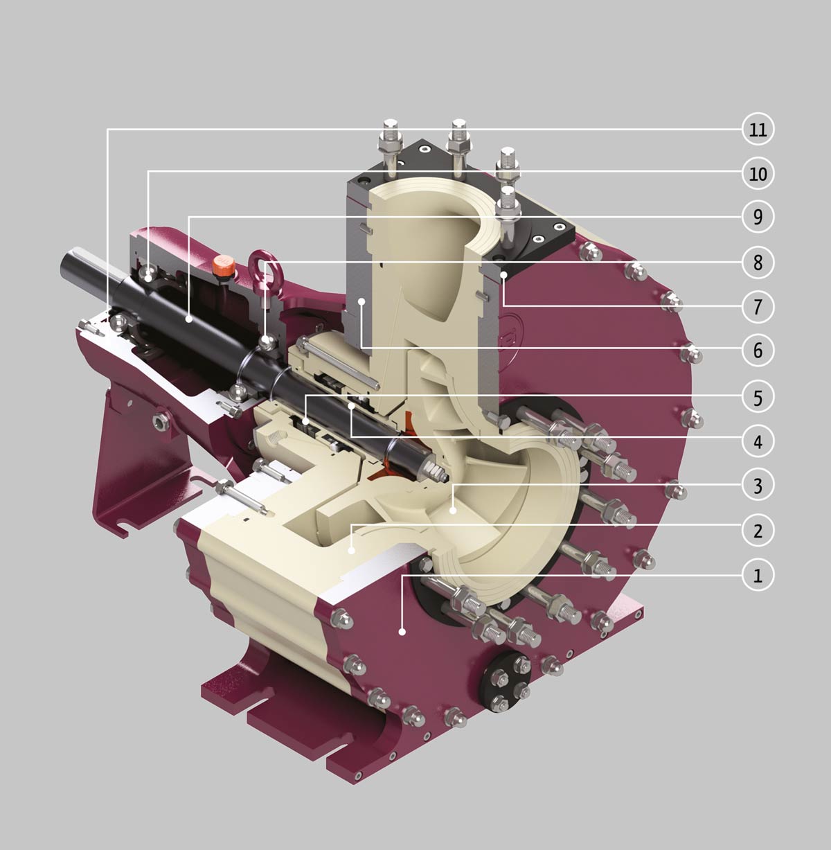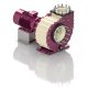 Suitable to transfer acid and basics solutions, the parts in contact with the liquid are build from a solid plastic (PP, PVDF, PE-UHMW) block and the gaskets present are in the right material (EPDM, FPM, FFKM).