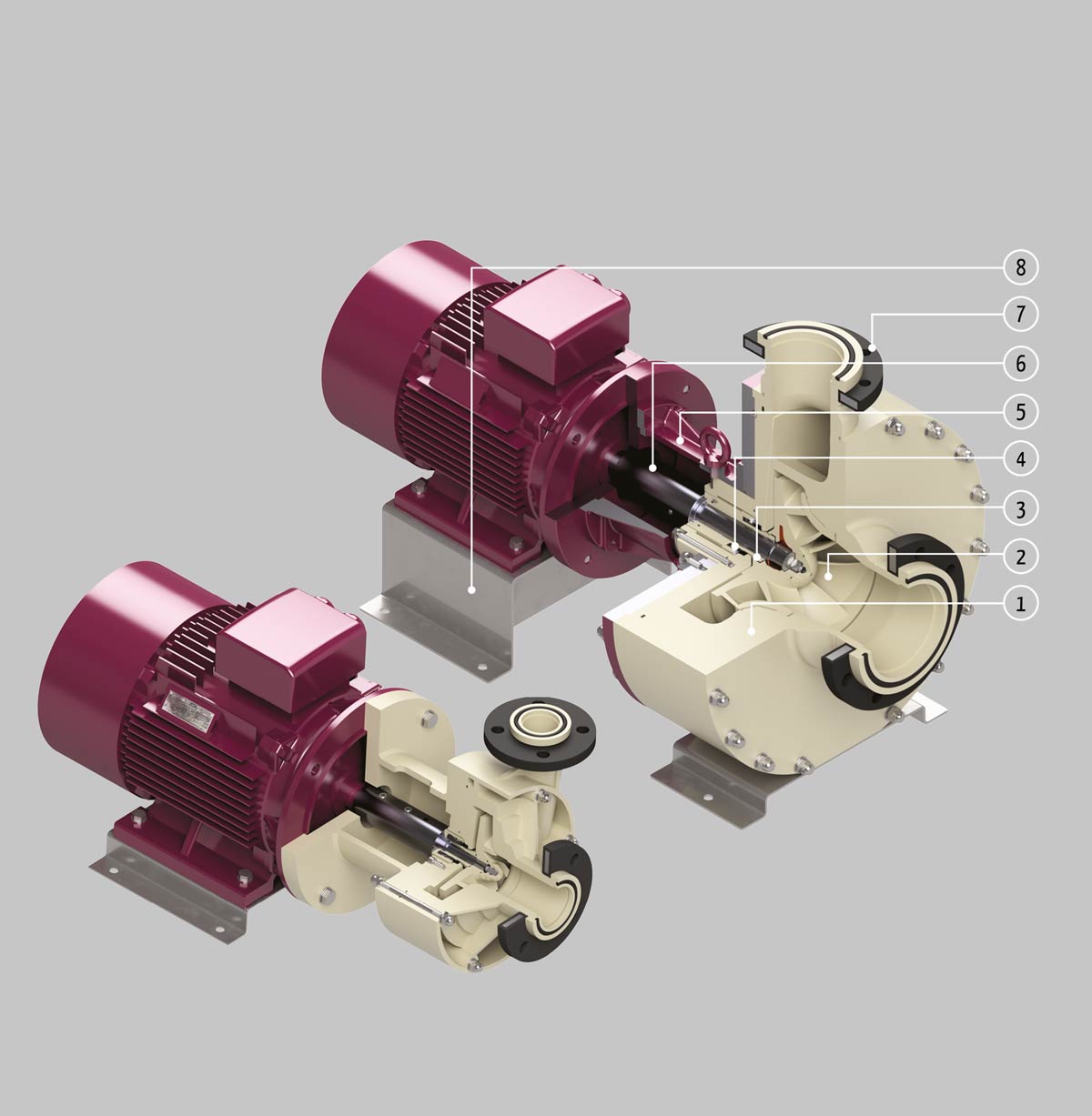 Suitable to transfer acid and basic solutions, the wet ends, are produced in thermoplastics (PP-PVDF) and O-ring in the proper elastomer material (EPDM-FPM-FEP-FFKM). Different mechanical seal solutions are available: from the lip seal to primary label seals (internal, external and double flushed) in standard version with faces in Silicon Carbide (SiC-SiC) and bellow elastomer (FPM-EPDM). The impellers installed are generally semi-open, but they are available in the closed version for hot liquids and without solids in suspension.